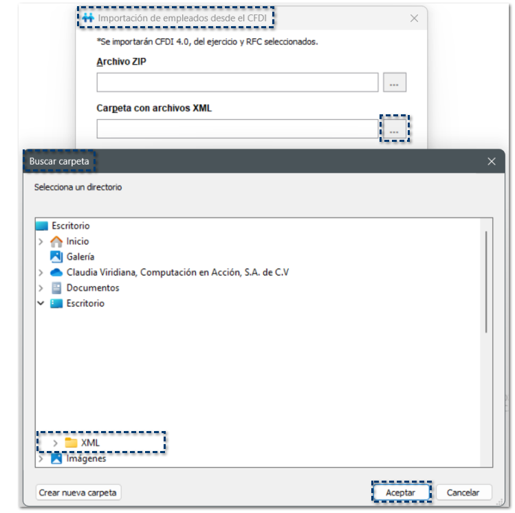 Al seleccionar la opción Carpeta con archivos XML, podrás seleccionar la carpeta que contenga los archivos XMLs a importar.