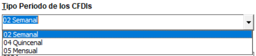 Se mostrará el listado de los tipos de periodos que estén dados de alta en tu empresa; por omisón, se mostrará la opción 02 Semanal.