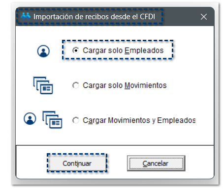 Para importar únicamente el catálogo de Empleados, selecciona la opción Cargar solo Empleados y haz clic en Continuar.