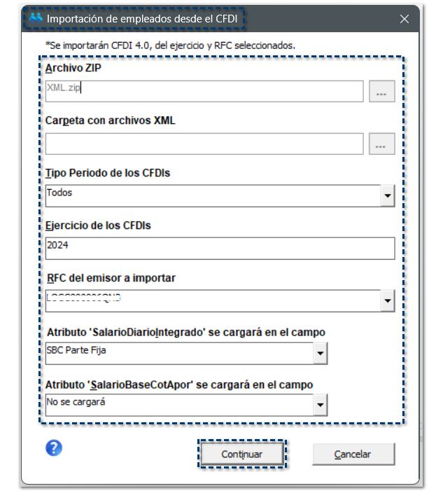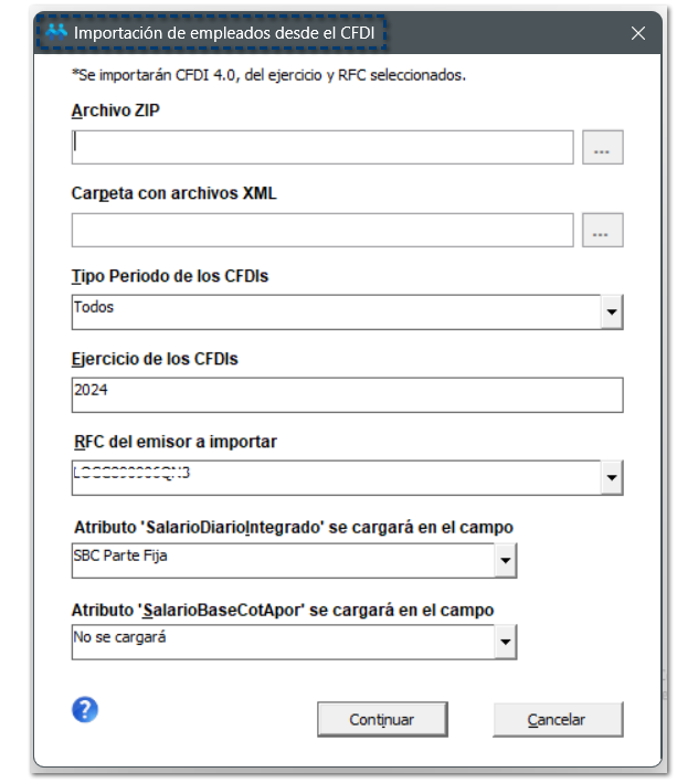 Visualizarás la ventana de parámetros del módulo Importación de empleados desde el CFDI: