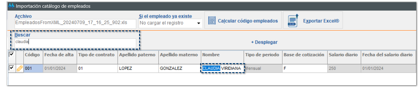 Podrás realizar la búsqueda de empleados por medio de palabras clave, si encuentra alguna coincidencia, mostrará únicamente los registros relacionados a tu búsqueda.