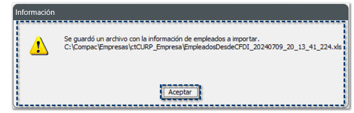 Se mostrará un mensaje de confirmación que nos indica que se ha guardado un archivo con la información de los empleados a importar.