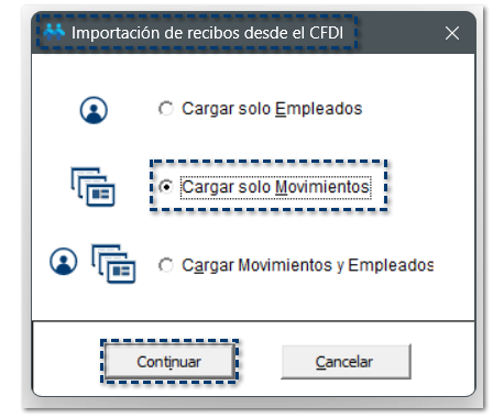 Para importar únicamente los Movimientos del CFDI de nómina, selecciona la opción Cargar solo Movimientos y haz clic en Continuar.