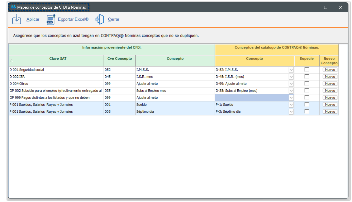 La relación se hace mediante la CLAVE SAT de los conceptos. Recuerda que encontrarás conceptos de tipo Percepción, Otros Pagos y Deducciones, con su correspondiente clave SAT.