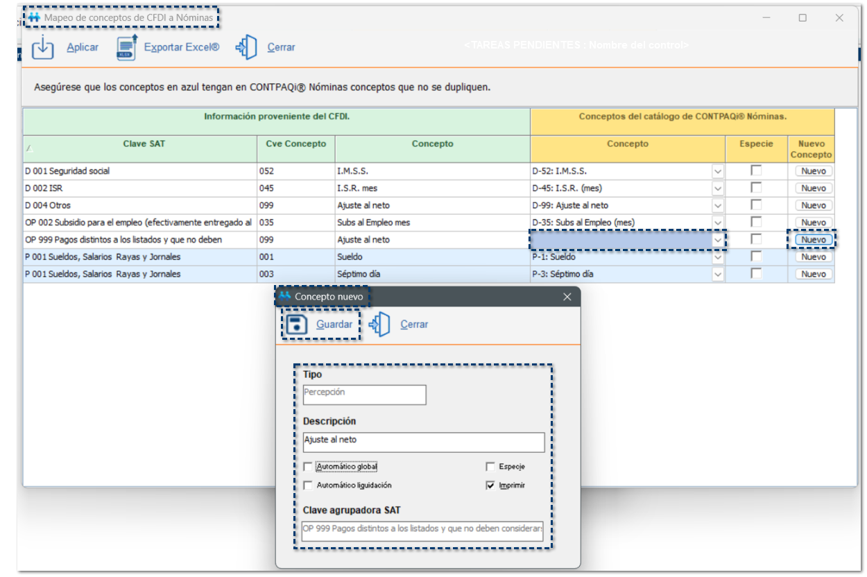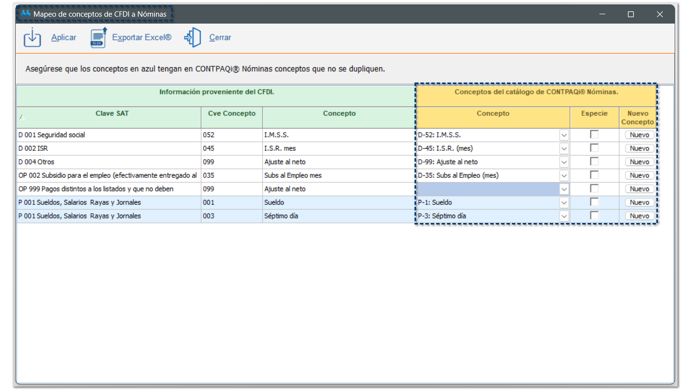 En dicha ventana es importante revisar los conceptos que se encontraron en los CFDI y relacionarlos con algún concepto de CONTPAQi Nóminas®.