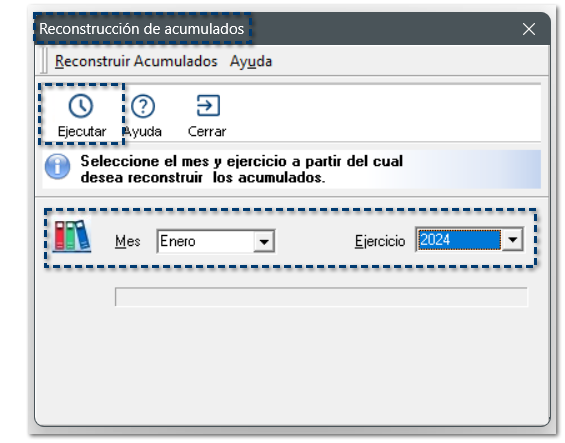 Visualizarás la ventana Reconstrucción de acumulados, en la cual deberás seleccionar el mes y ejercicio a partir del cual deseas reconstruir los acumulados.