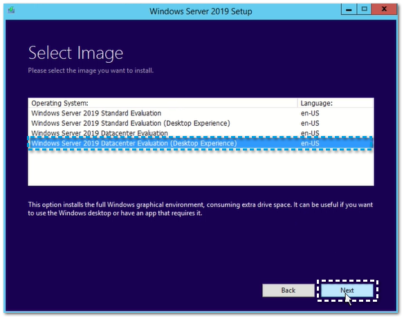 En esta ventana selecciona la imagen: Windows Server 2019 Datacenter Evaluation (Desktop Experience), y haz clic en Next.