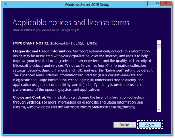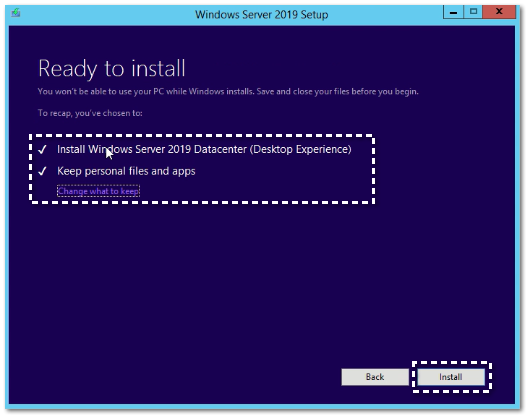 Para el proceso se debe elegir la opción: Windows Server 2019 Datacenter Evaluation (Desktop Experience), si eliges una opción distinta se presentarán errores en la actualización.