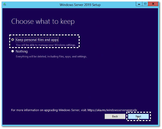 Enseguida, elige la opción: Keep personal files and apps para mantener las aplicaciones y archivos personales, haz clic en Next.