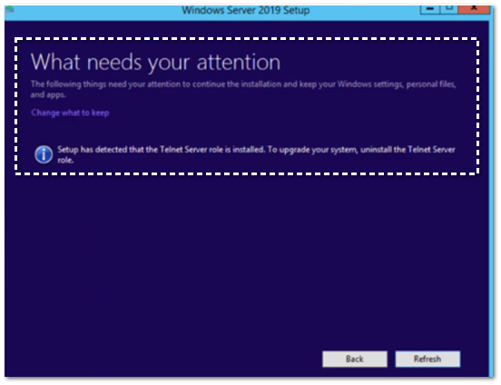 Al realizar la última revisión antes de iniciar con la instalación el sistema operativo, el proceso puede indicar si existe alguna característica y/o componente que afecte al proceso de actualización, por ejemplo, tener instalado TELNET, mostrándose de la siguiente manera.