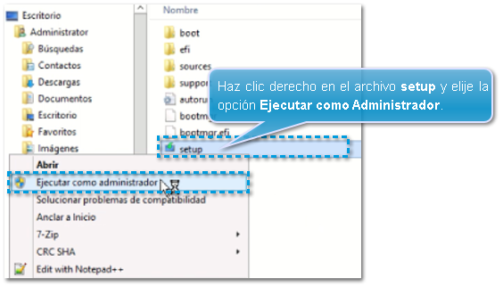 Descomprime el archivo e identifica el setup, haz clic derecho sobre el y elige Ejecutar como administrador.
