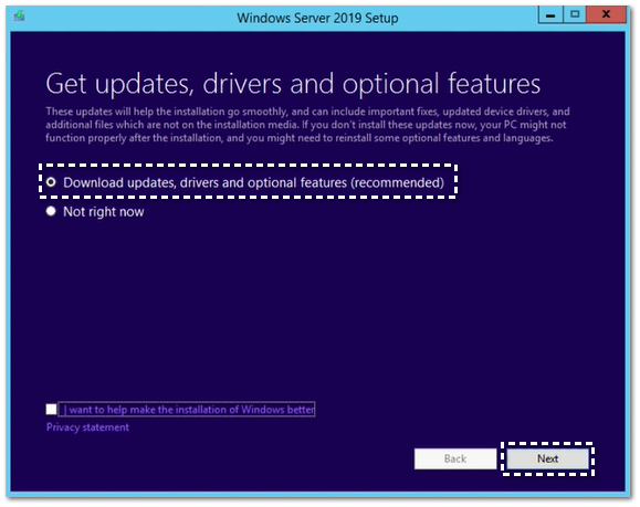 En la siguiente ventana elige Download updates, drivers and optional features (recommended), y haz clic en Next.