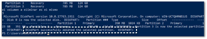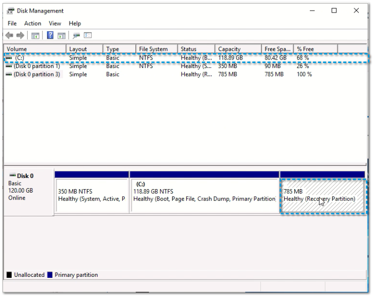 Se mostrará la siguiente ventana, selecciona la unidad (C:), e identifica la partición 785 MB Healthy.
