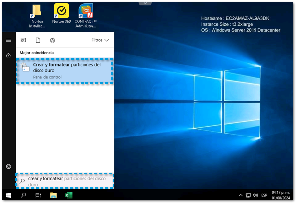 Ve al menú Inicio y en la barra de búsqueda escribe Crear y formatear particiones del disco duro, haz clic sobre la opción.