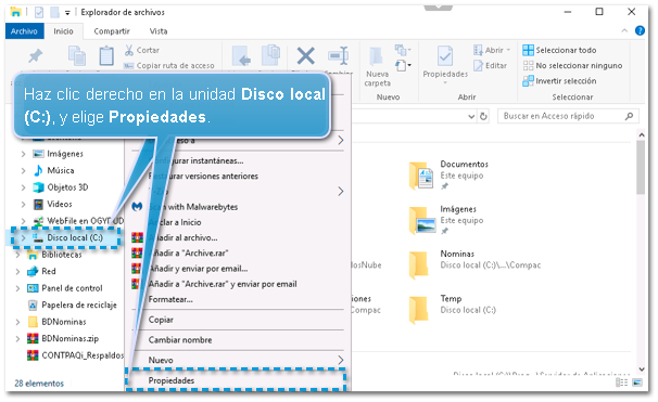 Identifica el Disco local (C:), haz clic derecho sobre el y elige Propiedades.