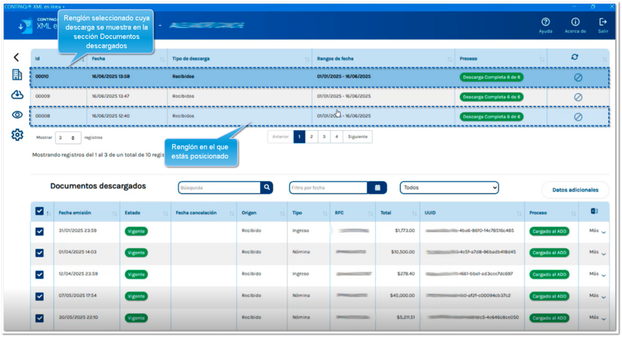 Para que puedas visualizar cuál es el renglón de descarga en la que estás posicionado, ahora lo mostramos con un color azul más tenue, para diferenciarlo de la fila seleccionada que muestra el detalle de los documentos descargados.