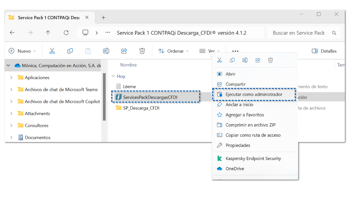 Sobre el archivo ServicesPackDescargasCFDI.exe, haz clic derecho y selecciona la opción Ejecutar como Administrador.