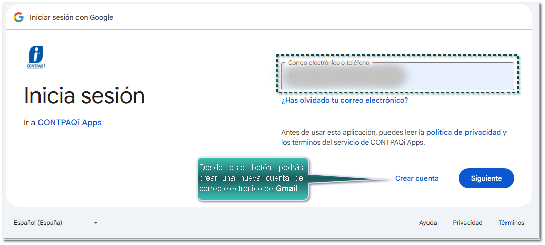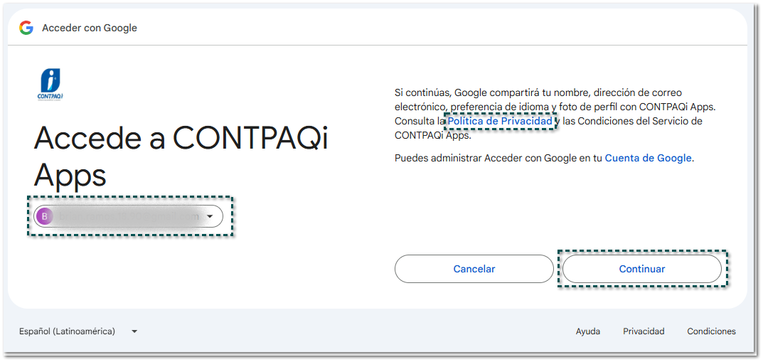 Asegúrate de que la cuenta a utilizar sea la correcta, consulta y aceptar la Política de Privacidad y posteriormente haz clic en el botón Continuar: