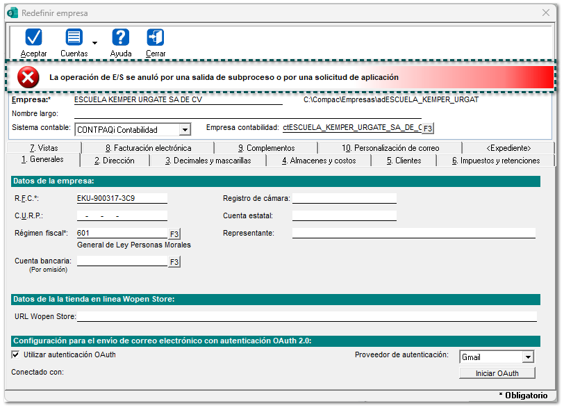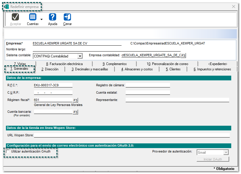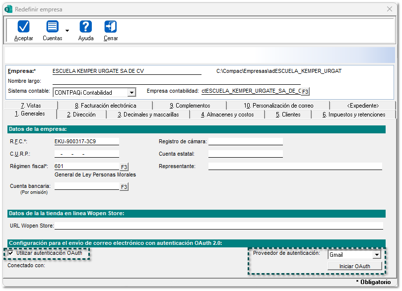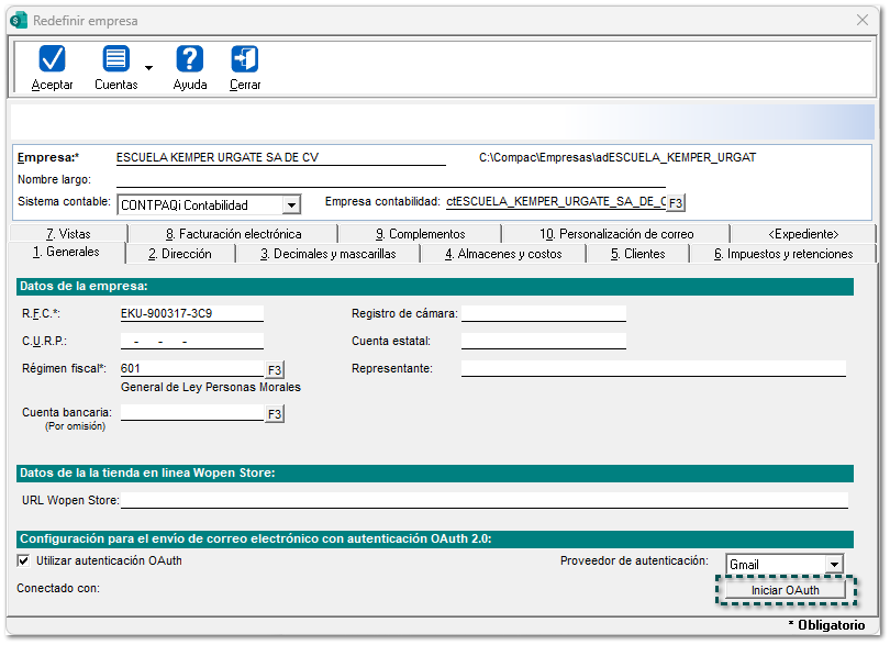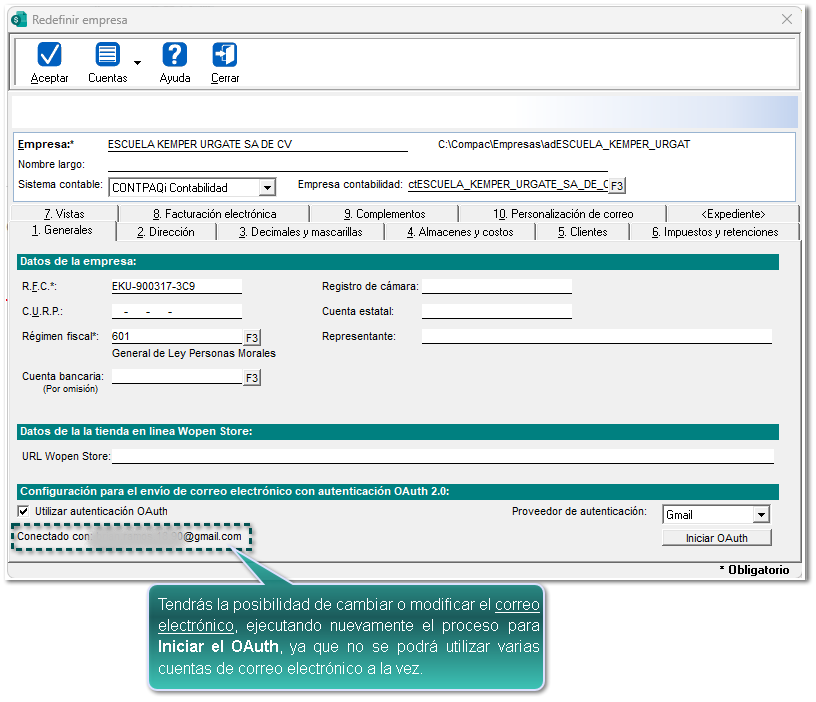 Se guardará la configuración de Gmail, y se mostrará la ventana Redefinir empresa con el correo registrado.