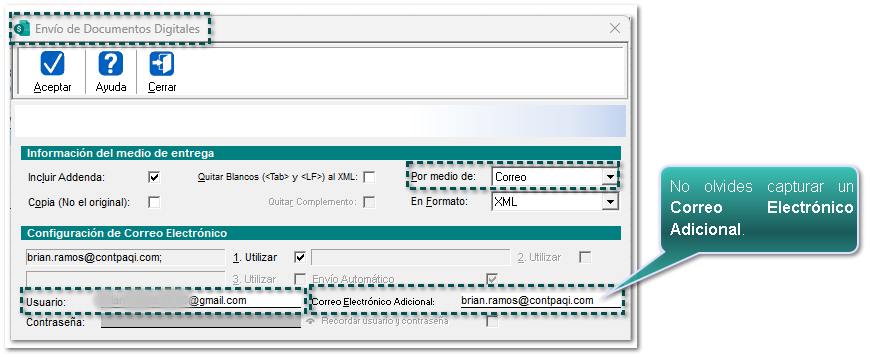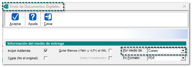 En la ventana para el Envío de Documentos Digitales selecciona el método de envío "Correo".