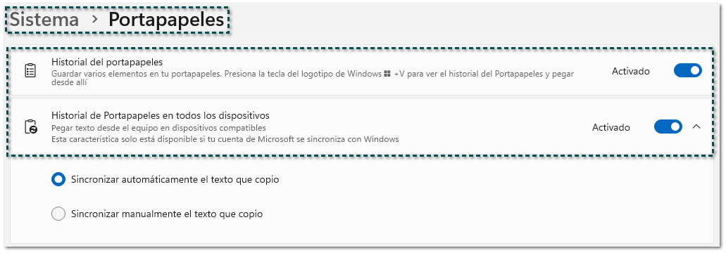 Para habilitar el uso del Portapapeles en Windows, realiza lo siguiente: