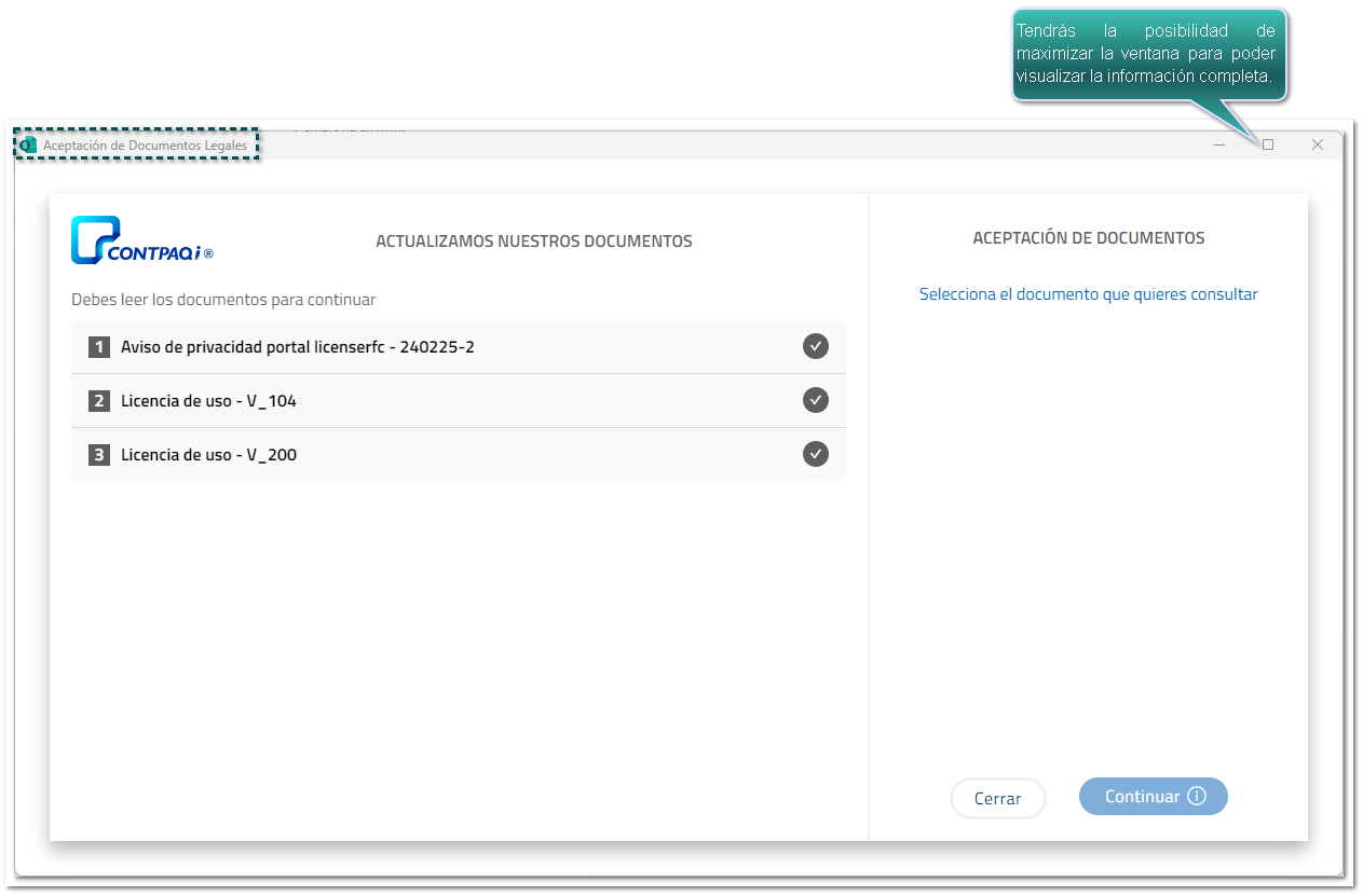 A partir de esta versión, al acceder al sistema se deberán aceptar los documentos legales para poder ingresar a una empresa.