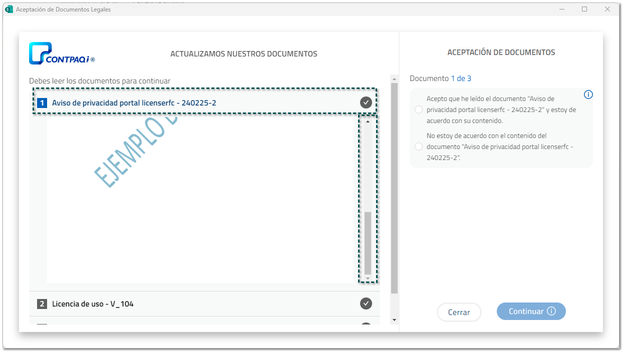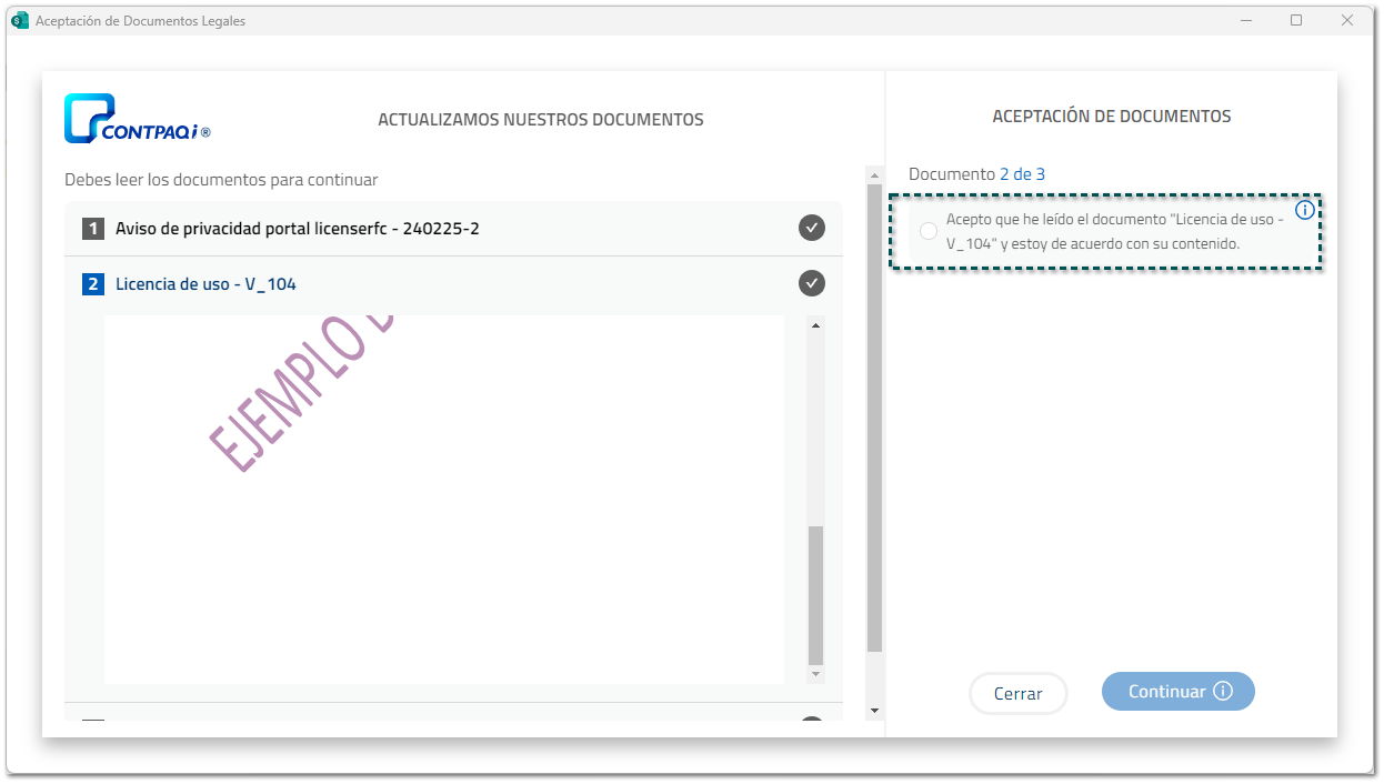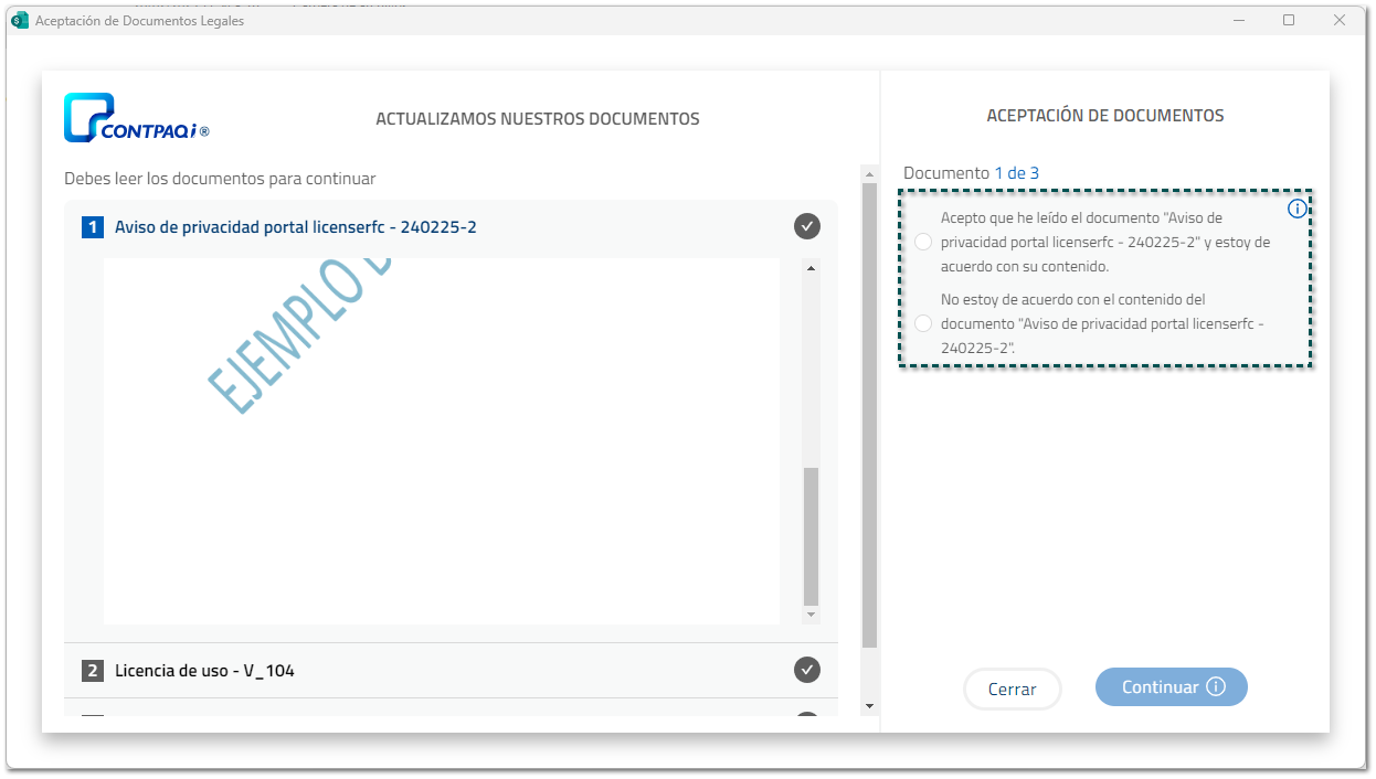 Al momento de tratar de ingresar a una empresa, CONTPAQi Comercial Premium® validará si existen documentos pendientes por aceptar para ese RFC (empresa) y se mostrará la ventana "Aceptación de Documentos Legales":