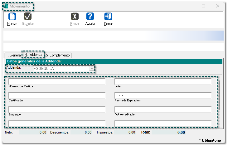 Addenda "ASOMQUILA " Folio-Ticket C658452 A partir de ahora, se incluye la Addenda ASOMQUILA a CONTPAQi Comercial Premium®, con los siguientes campos de captura a nivel de: Movimiento Documento
