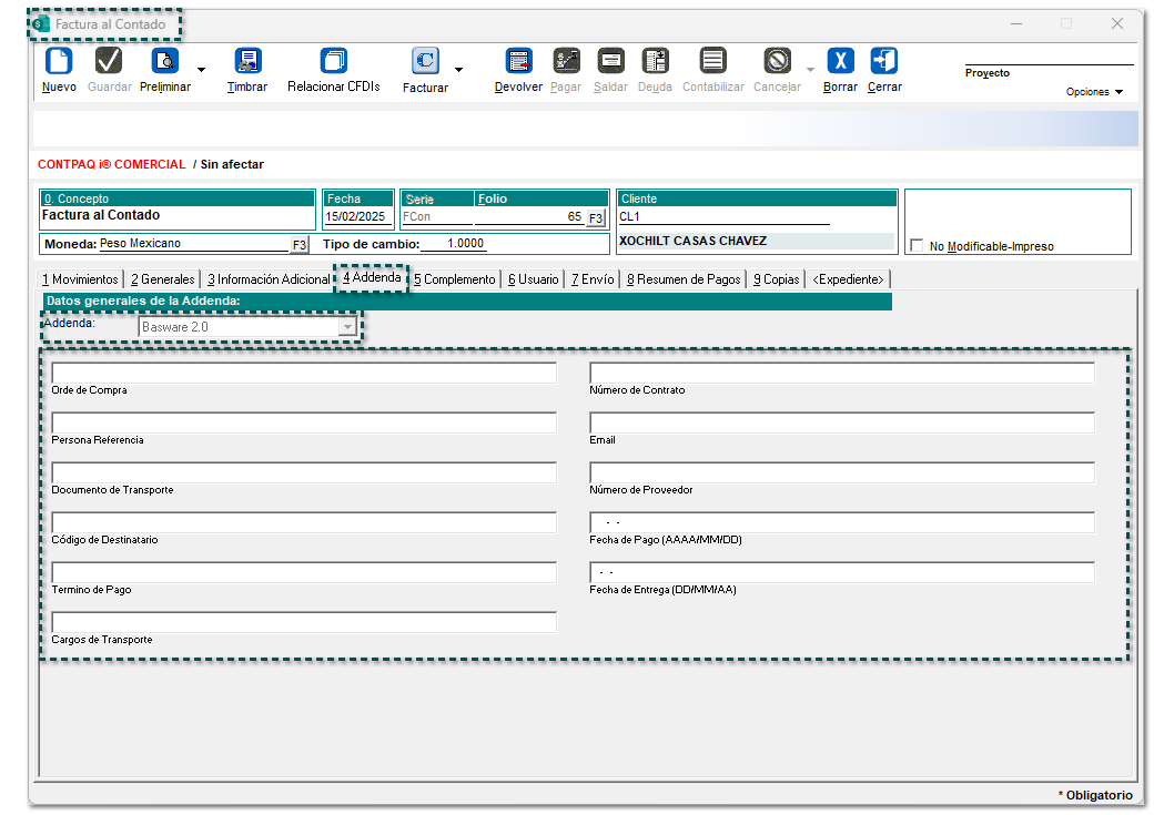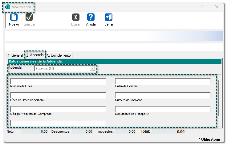 Addenda "Basware 2.0" Folio-Ticket C657123 A partir de esta versión, se adiciona la Addenda Basware 2.0 al sistema comercial, con los siguientes campos de captura a nivel de: Movimiento Documento