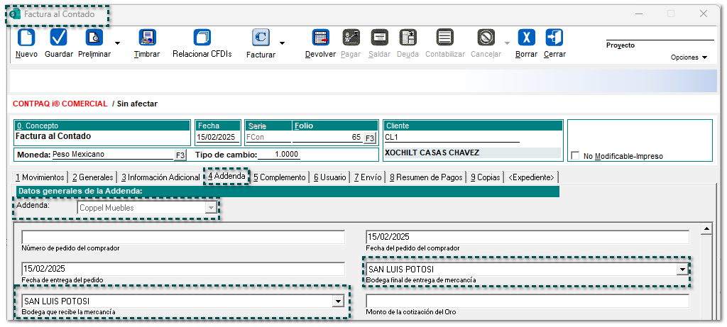 Folio D639815 A partir de esta versión, se agrega la Cedis: SAN LUIS POTOSÍ en los campos "Bodega que recibe la mercancía" y "Bodega final de entrega de mercancía" a nivel Documento en la Addenda Coppel Muebles.