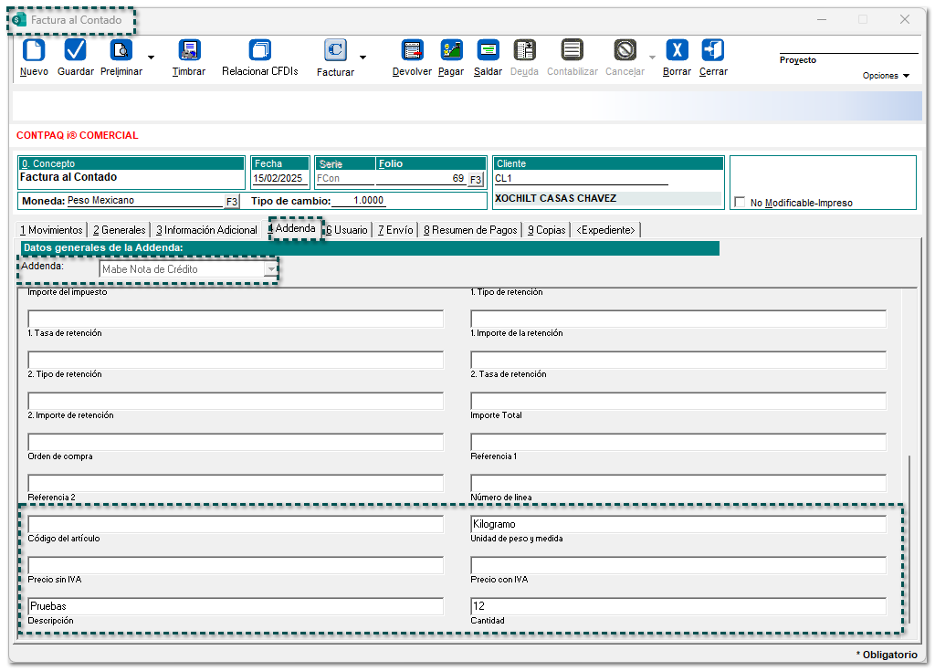 Ahora, se modifica la Addenda Mabe Nota de Crédito para que, en los campos "Descripción", "Unidad" y "Cantidad" se permitan capturar de forma manual la información a nivel documento, ya que, en versiones anteriores el sistema los generaba de manera automática, y al no incluir alguna descripción de un producto, aparecía la leyenda "Ninguno" en el XML.