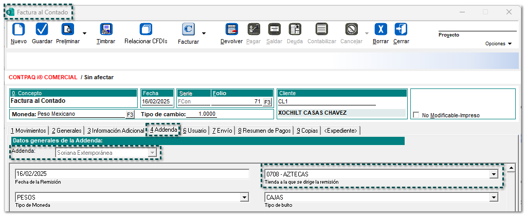 Folio D665904 En esta versión, se incluyen las sucursales: 0708 - AZTECAS, 0709 - TULUM y 1601 - HUAYACAN respectivamente en el campo "Tienda a la que se dirige la remisión" a la Addenda Soriana Extemporánea a nivel Documento: