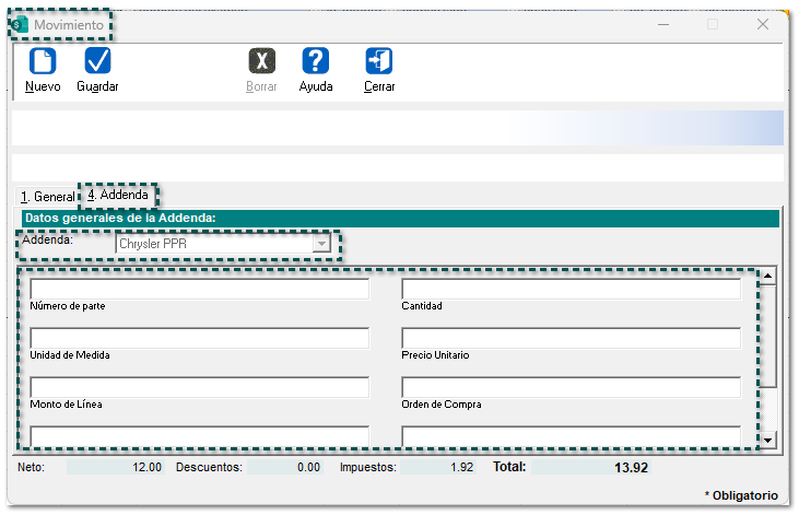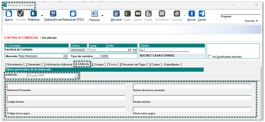 Addenda "Chrysler PPR" Folio-Ticket C690320 En esta versión, se adiciona la Addenda Chrysler PPR a CONTPAQi Comercial Premium®, con los siguientes campos de captura a nivel de: Cliente Movimiento Documento
