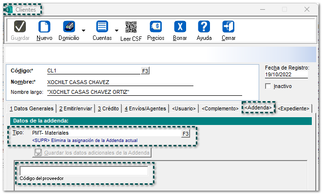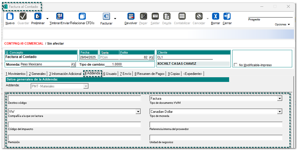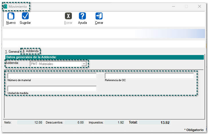 Addenda "PMT- Materiales" Folio-Ticket C687394 A partir de ahora, se incluye la Addenda PMT- Materiales al sistema comercial, con los siguientes campos de captura a nivel de: Cliente Movimiento Documento