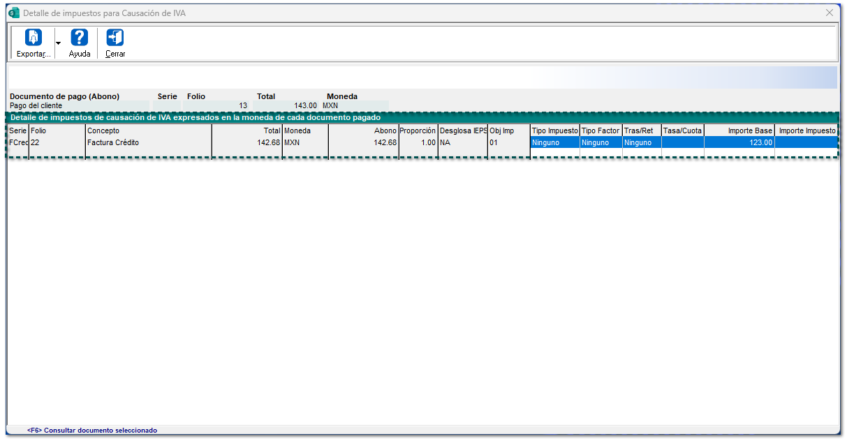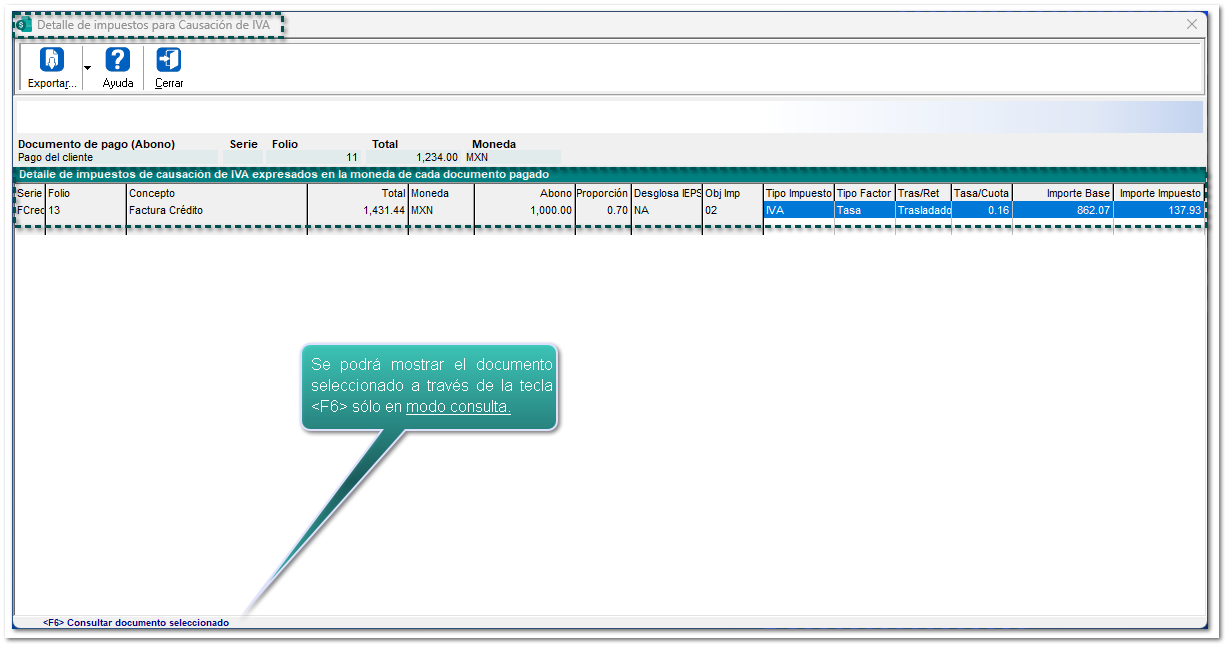 Recuerda que la ventana de Detalle de impuestos para Causación de IVA para documentos de Pagos al cliente, permite ver cada uno de los acumulados de los impuestos de cada factura pagado por el documento de REP, y cada uno de estos registros se envían a CONTPAQi Contabilidad®, ya sea al contabilizar el documento desde el propio documento o desde el proceso de "Cargado de la base gravable del IVA a CONTABILIDAD".