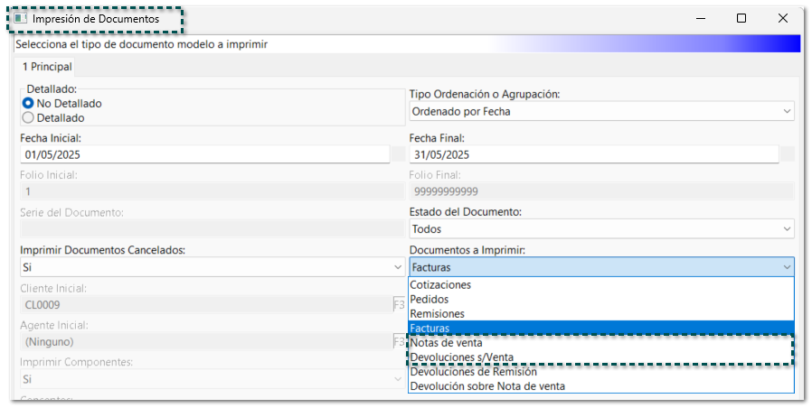 Se adiciona el filtro "Documentos a imprimir", para que se puedan visualizar los documentos para la Captura de Notas de venta (Notas de venta y Devolución sobre Notas de venta).