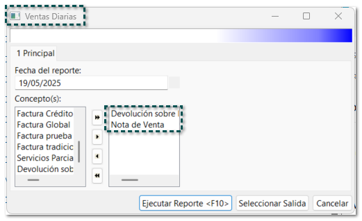 Se adiciona en el filtro "Conceptos", los conceptos de Devolución sobre Notas de venta y Nota de Venta: