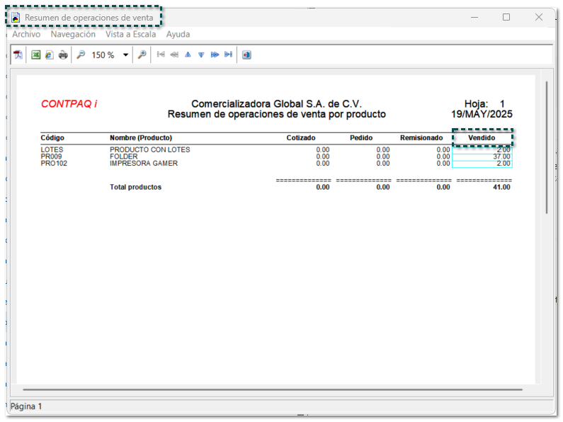 Resumen de operaciones de ventaModificación del título de "Facturado" a "Vendido":