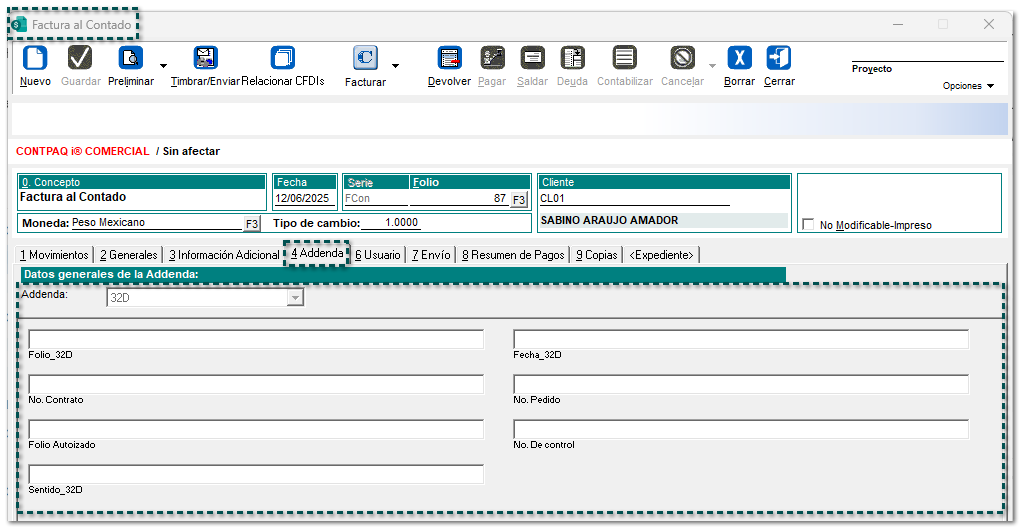 Addenda "32D" Folio-Ticket C694521 A partir de esta versión, se añade la Addenda 32D a CONTPAQi Comercial Premium®, con los siguientes campos de captura a nivel de: Documento