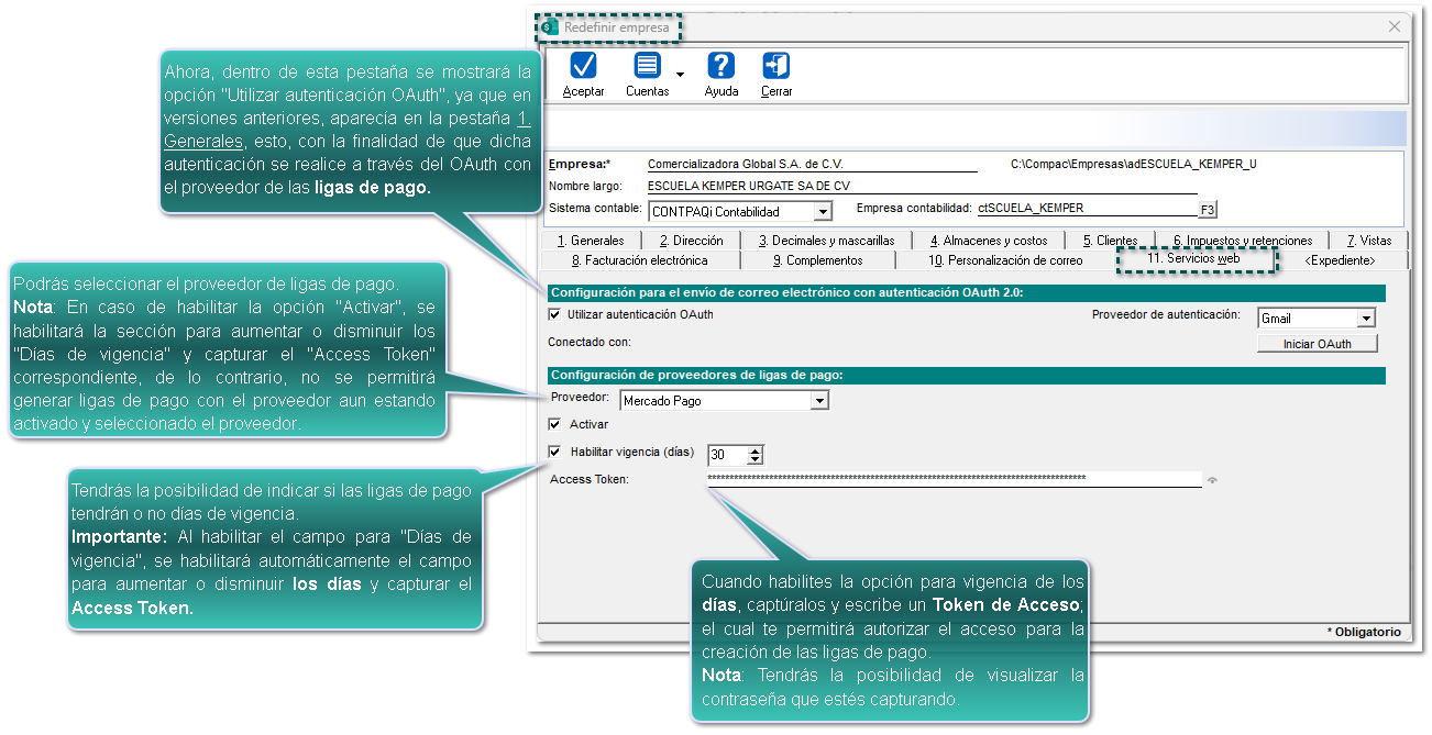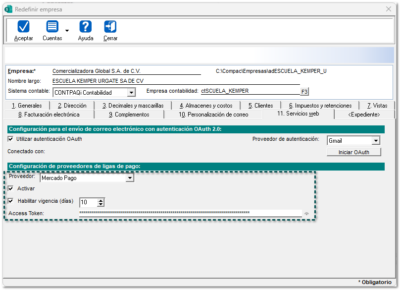 Dentro de la ventana Redefinir empresa, se agrega la pestaña 11. Servicios Web, para poder realizar la configuración de proveedores de ligas de pago.