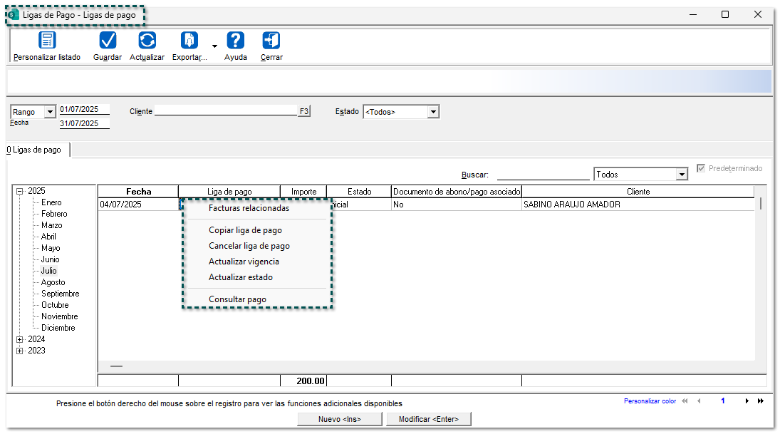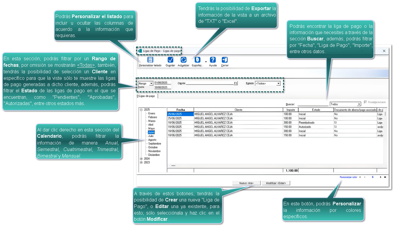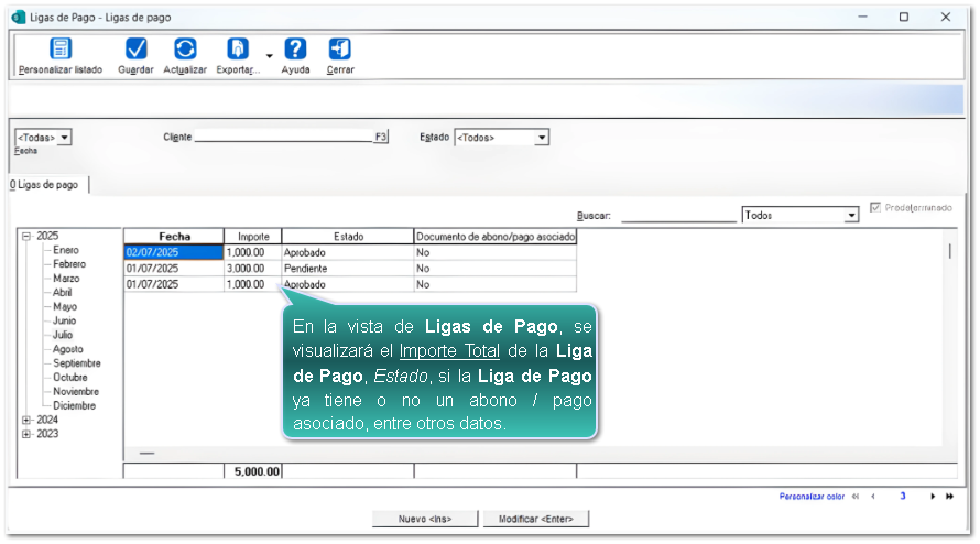 Al ingresar a dicha opción, se mostrará la ventana Ligas de Pago, en la cual, se mostrarán diferentes opciones para poder filtrar los datos, especificar un rango de fechas, seleccionar un cliente, así como filtrar por el estado de la Liga de Pago.