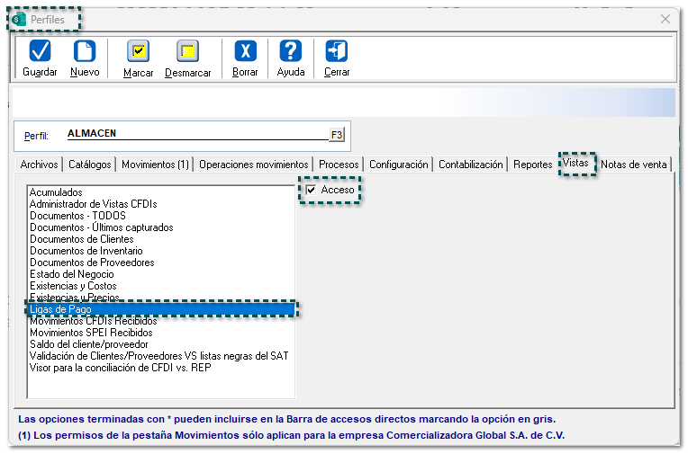 Desde el perfil del usuario, podrás definir qué perfiles podrán tener acceso y permisos para ingresar a la opción "Ligas de Pago", por lo que, desde la pestaña Vistas, tendrás la posibilidad de habilitar o deshabilitar dicha opción: