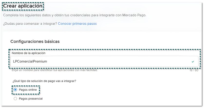 Ingresa un Nombre de la aplicación y elige la opción "Pagos online" en la sección ¿Qué tipo de solución de pago vas a integrar?