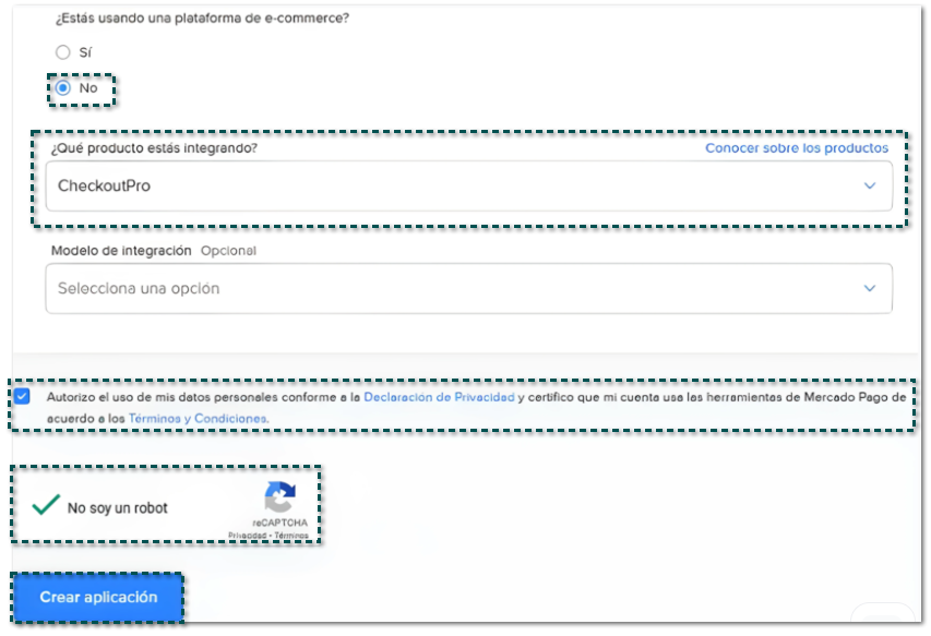 ![]() En la sección ¿Estás usando una plataforma de e-commerce?, habilita la opción "No", elige "CheckoutPro" en la sección ¿Qué producto estás integrando?, autoriza el uso de los datos personales, haz clic en "No soy un robot" y da clic en el botón Crear aplicación.