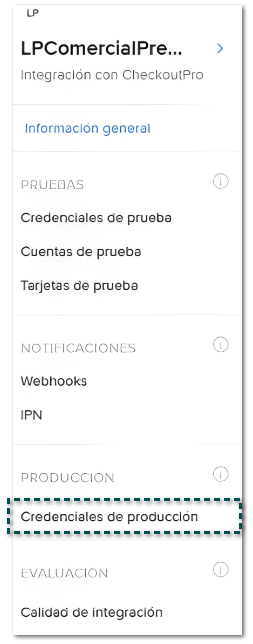 ![]() Posteriormente, da clic en la opción Credenciales de producción encontrada en la parte izquierda de la pantalla.