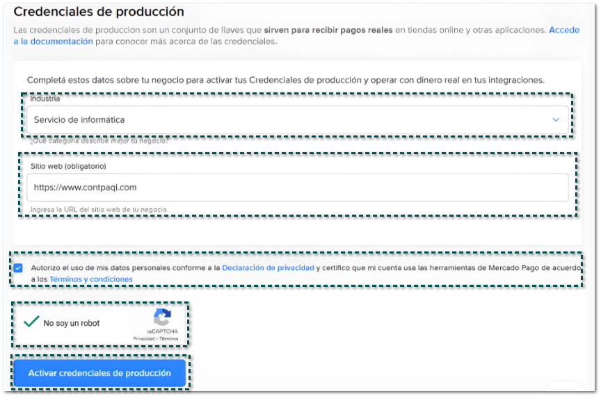 Aparecerán las Credenciales de producción, defínelas como se muestra en la siguiente imagen, autoriza el uso de datos personales, da clic en el botón "No soy un robot" y haz clic en el botón Activar credenciales de producción.