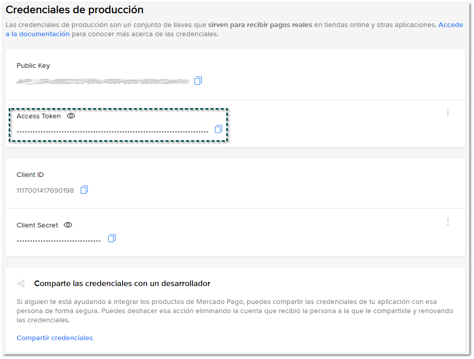 Se visualizarán los datos de las credenciales, y haz clic en el botón copiar del Access Token, el cual deberás pegar en el sistema comercial para poder utilizar las Liga de Pago.