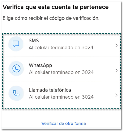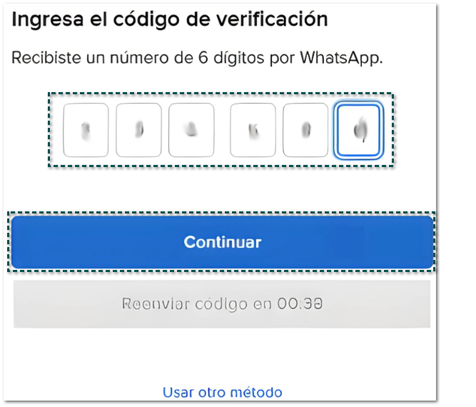Al momento de seleccionar la opción para elegir cómo recibirás el código de verificación, te llegará un código, captúralo y haz clic en el botón Continuar.