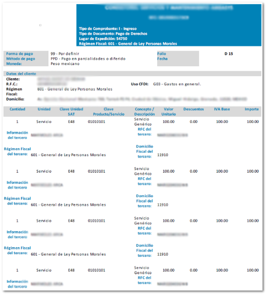 A partir de esta versión, al visualizar la vista previa de los documentos de Facturas Cliente, se mostrará de forma correcta la información del documento al utilizar el formato: Modelo_CFDI_v40_Pro_InformacionDelTercero.htm.