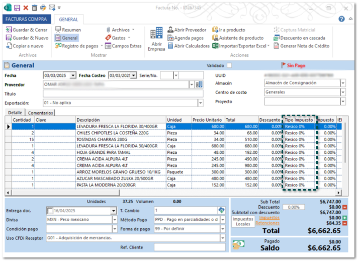 Anteriormente, al generar documentos de Facturas compra a partir de los XML Recibidos, se mostraba el Tipo impuesto IVA 0% en lugar del impuesto incluido en el XML Resico 0%.